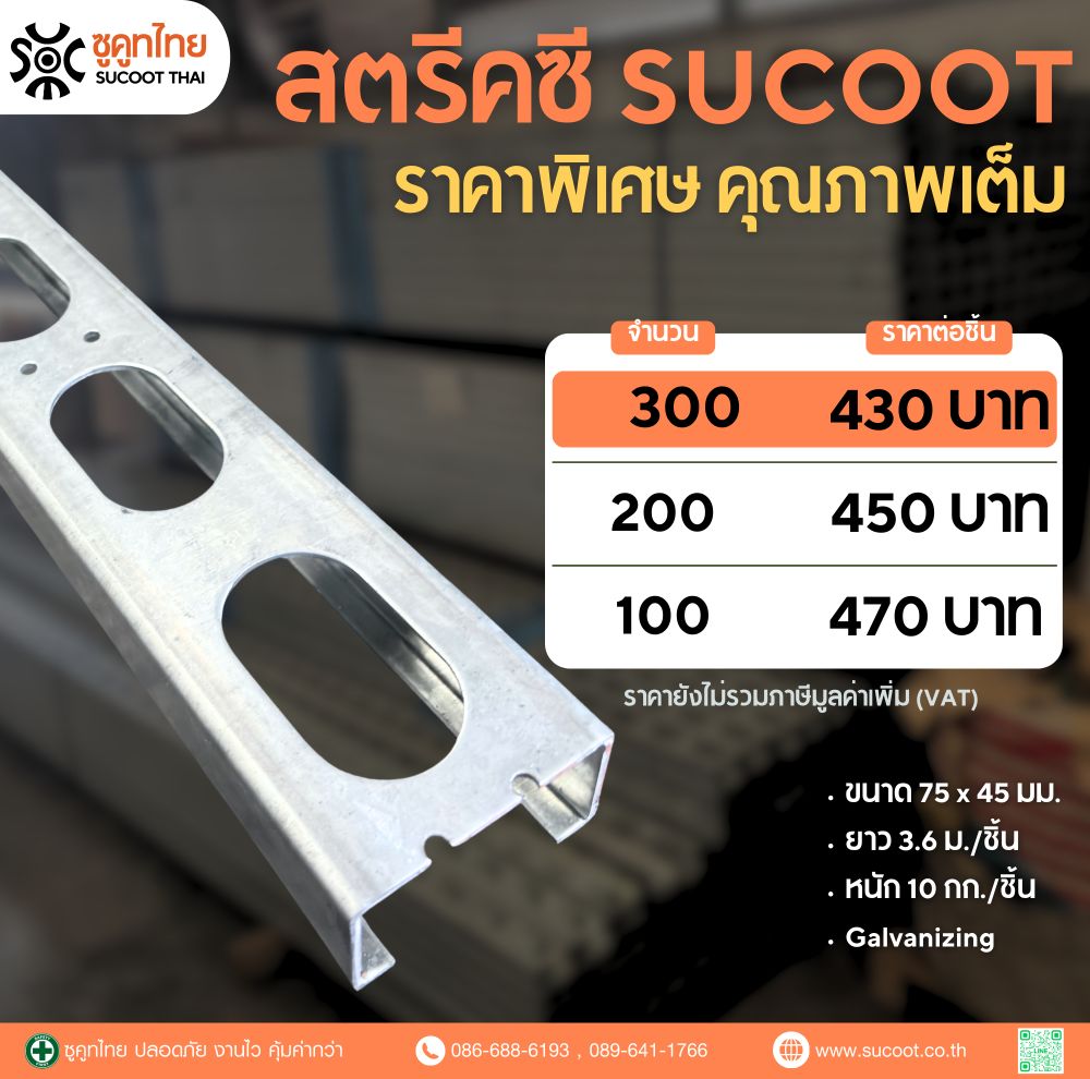 เหล็กสตรัคซี ขนาด 75x45 มม. ยาว 3.6 ม./ชิ้น หนัก 10 กก./ชิ้น Galvanizing สามารถสั่งตัดได้